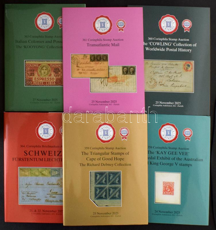 Corinphila 2025 novemberi árveréseinek katalógusai, 10 kötet https://www.darabanth.com/de/515-Auktion-Philatelie-Postkarten-Numismatik-Kunstwerke-Bucher-Schreibwaren-Schmuck/518.0/Erlesene-Lose-und-Sammlungen-Ungarn/Kataloge-Fachliteratur~77/Corinphila-2025-novemberi-arvereseinek-katalogusai-10-kotet~II3472202