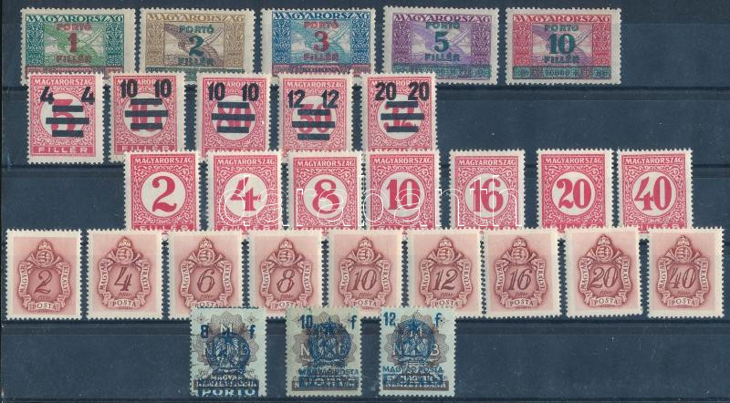 1927-1941 Kis portó tétel, benne Ikrusz, Pengő-fillér II, Kisegítő, Barna és Bankjegy portó bélyege stecklapon (21.100)