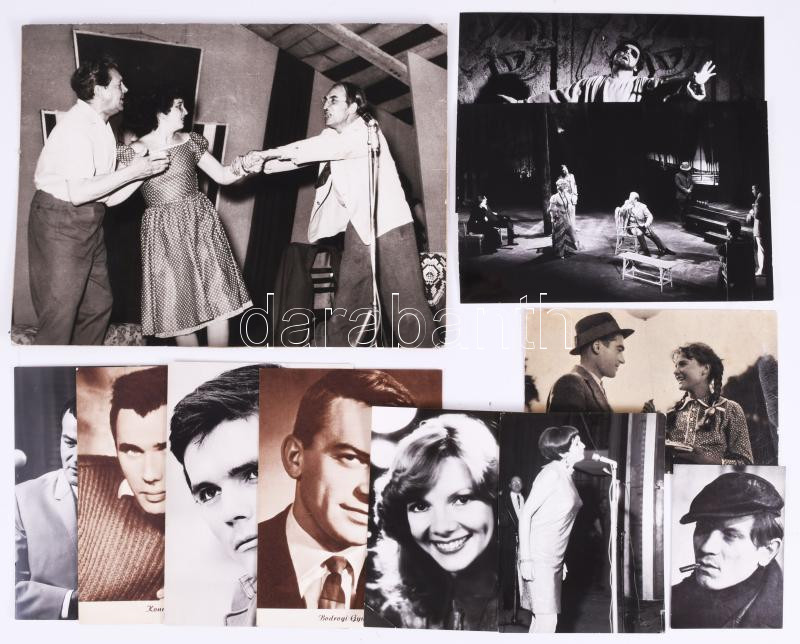 11 db magyar színészeket, színésznőket ábrázoló fotó és nyomtatvány, változó méretben és állapotban, 18x24 cm-ig