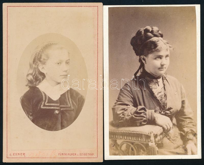 cca 1870 Hölgyek portréja, 2 db keményhátú fotó Exner Gyula és Exner Károly műterméből, 10,5×6,5 cm