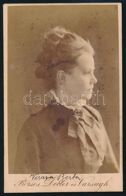 cca 1875-1880 Hölgy portréja, vizitkártya Borsos, Doctor és Varságh budapesti műterméből, kissé foltos, 10,5x6,5 cm