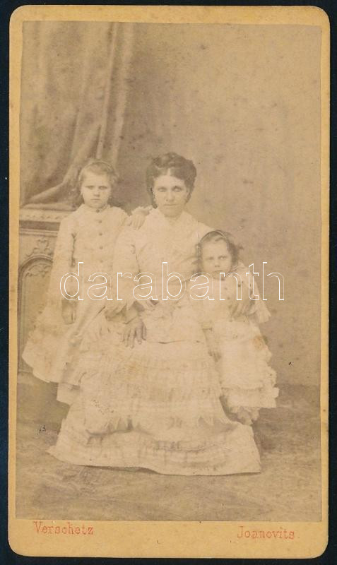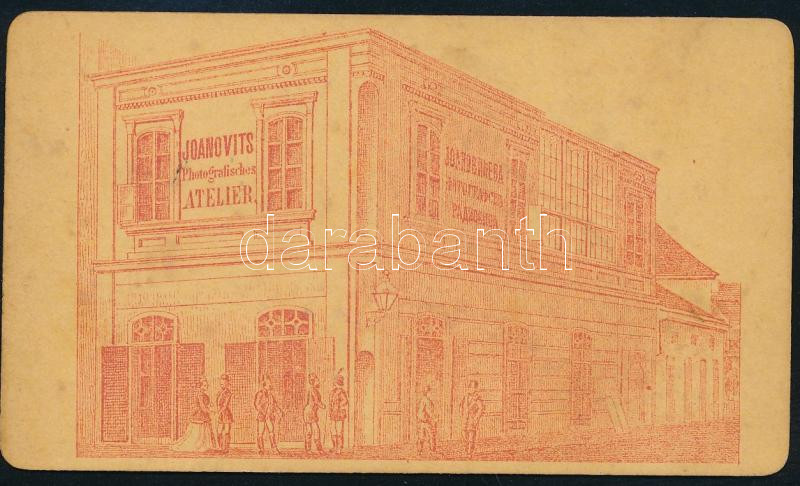 cca 1875 Anya gyermekeivel, vizitkártya Joanovits Stefán verseci műterméből, a verzón a műterem ábrázolásával, 10,5x6 cm