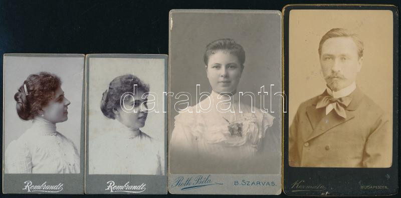 cca 1890-1915 Négy db keményhátú fotó, közte 2 db mignon, Rembrandt, Kozmata és Roth Béla műtermeiből, 8×4,5 és 10,5×6,5 cm