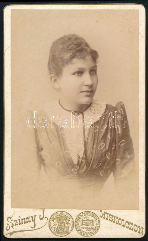 cca 1890 Női portré, keményhátú fotó Szinay István miskolci műterméből, 10,5×6,5 cm