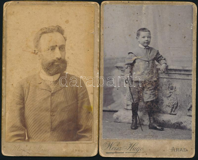 cca 1900 Műtermi portrék, 2 db keményhátú fotó aradi műtermekből, sérülésekkel, 10,5×6,5 cm