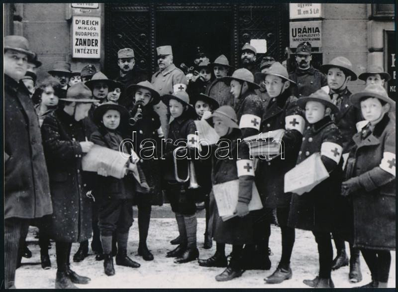 cca 1914 Müllner János (1870-1925) budapesti fényképész felvétele (adományt gyűjtő cserkészek "bevetés" előtt), 1 db modern nagyítás, jelzés nélkül, 15x21 cm