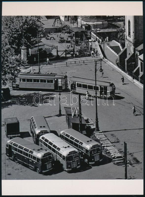 cca 1947 Budapest, villamosforduló és autóbusz-végállomás a lerombolt Erzsébet híd pesti hídfőjénél, 1 db modern nagyítás, jelzés nélkül, 21x15 cm