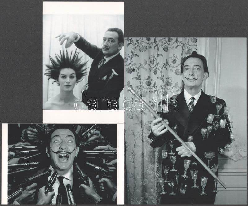 cca 1960 előtti felvételek Dali, Salvador (1904-1989) katalán - spanyol szürrealista festőművészről, aki fényképezés közben gyakran önmagát rendezte, vagyis kitalálta előre a képet, s ehhez hívott fotós segítséget, eltérő időben készült felvételek, 3 db modern nagyítás, jelzés nélkül (Dali, a delejes), 21x15 cm és 15x10 cm