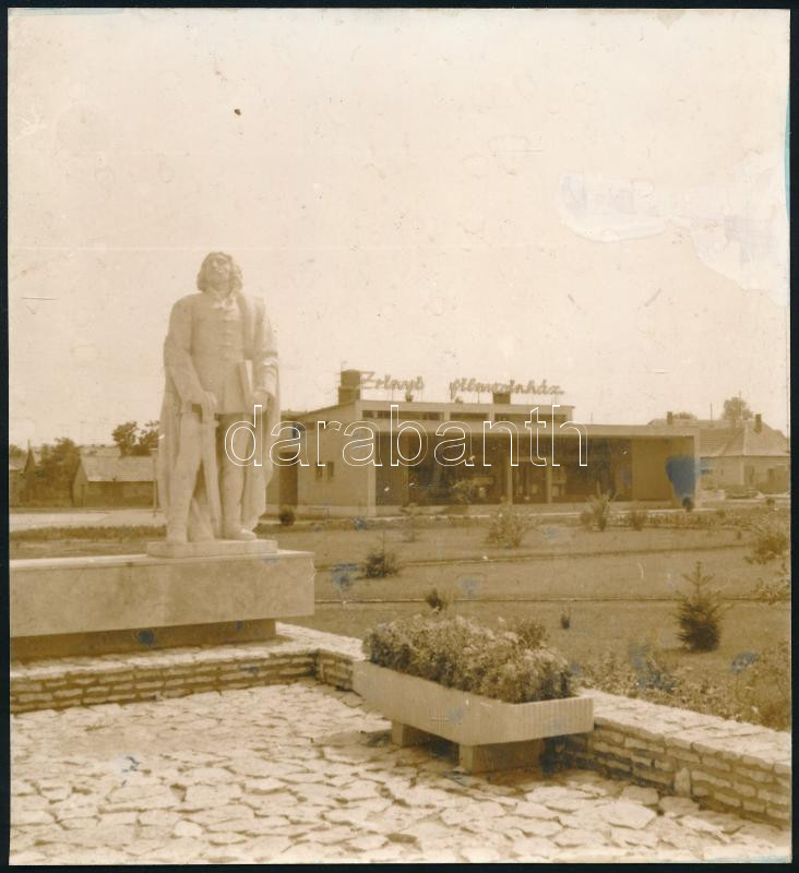 cca 1970 A szigetvári Zrínyi-szobor és a mögötte levő Zrínyi Filmszínházról készített fotó, hátoldalán kasírozásnyommal, felületén javítás, 19×17,5 cm