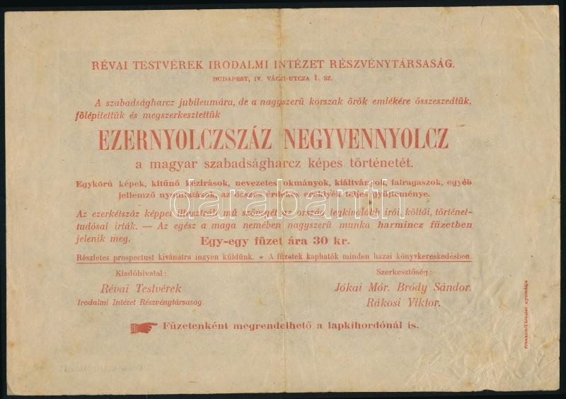 cca 1898 A Révai Testvérek Irodalmi Intézet Rt. "Ezernyolczszáz negyvennyolcz. Az 1848/49-iki magyar szabadságharcz története képekben." c. kiadványának reklámlapja, másik oldalán 100Ft-os bankjegy ("Kossuth bankó") ábrázolásával, 15x21 cm