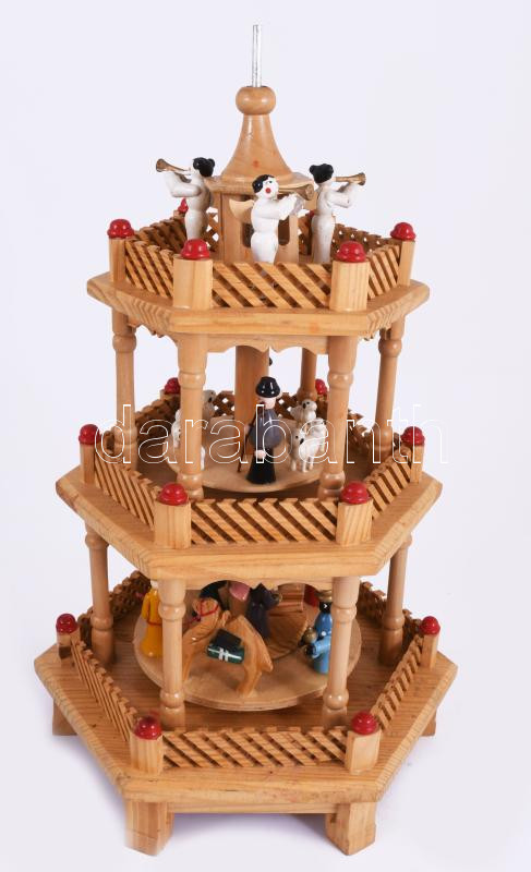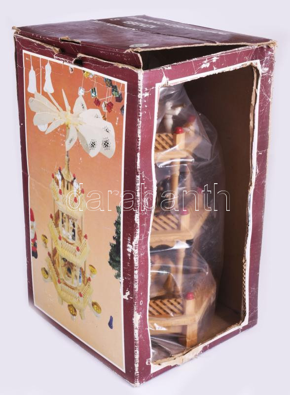 Háromszintes karácsonyi forgó, gyertyák hője mozgatja, sérült dobozában, m: 36 cm