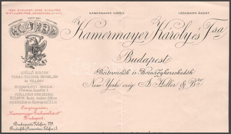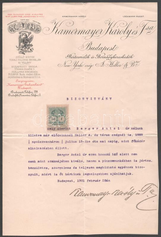 1901 Kamermayer Károly Bortermelő és Bornagykereskedő munkáltatói igazolása Berger Antal főkádár részére, 30 f. okmánybélyeggel, fejléces papíron, aláírással.