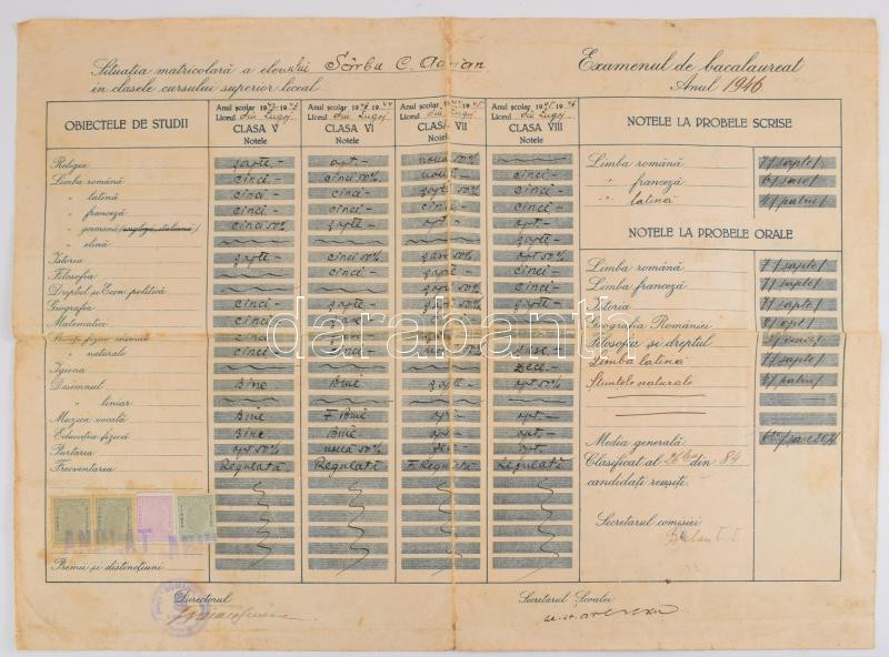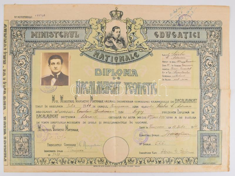 1946 Románia Temesvári egyetem irodalom szakos diploma, fényképes, még a király képével 44x33 cm 1946 Romania University of Timisoara literature diploma, with photograph, still with the king's picture, 44x33 cm