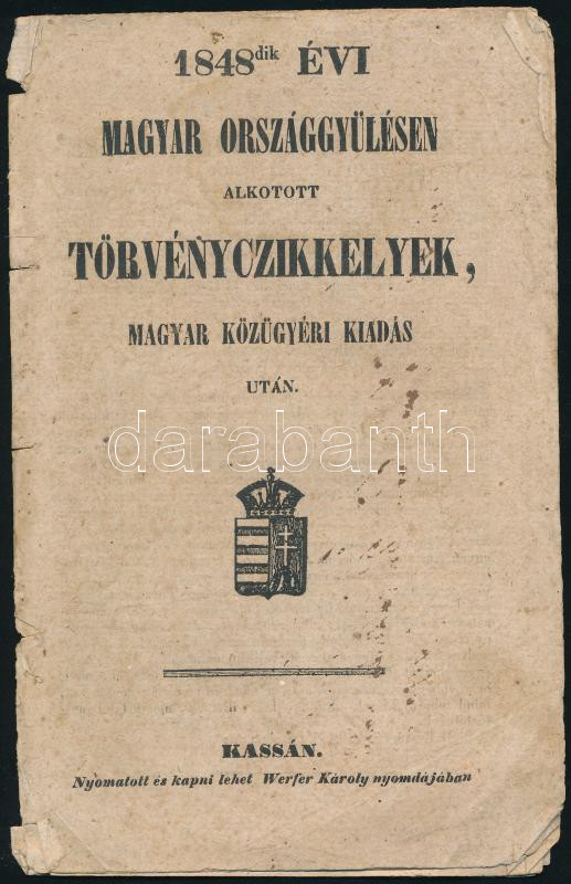 1848-dik évi magyar országgyülésen alkotott törvényczikkelyek, magyar közügyéri kiadás után Hiányos! Csak az első 16 oldal. Kassa, (1848), Wefer Károly-ny., 56 p.