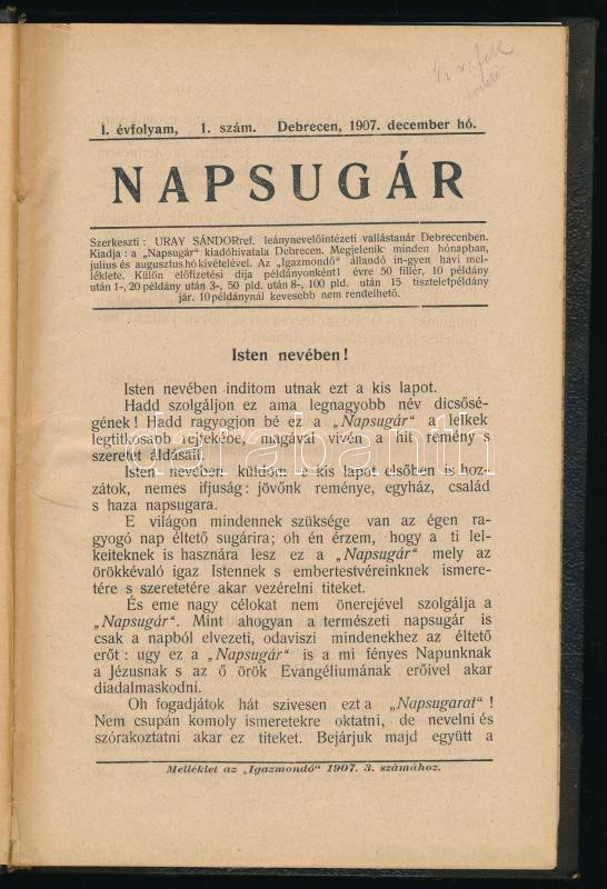 1907-1909 A Napsugár c. debreceni folyóirat teljes I-II. évfolyama egybekötve (I. évf. 1-10. sz. + II. évf. 1-10. sz.), szerk.: Uray Sándor. Félvászon-kötésben, nagyrészt jó állapotban.