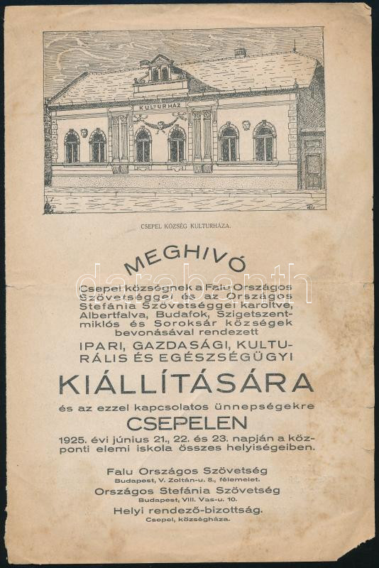 1925 Csepel községnek Albertfalva, Budafok, Szigetszentmiklós és Soroksár községek bevonásával rendezett kiállítási szórólapja.