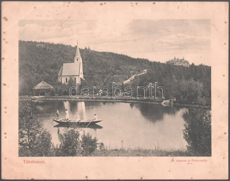 cca 1910 Tátralomnic, evangélikus templom és Palota-szálló, fotónyomat, kiadja Kuszmann Gyula, Tátralomnic, foltos, 24x30,5 cm