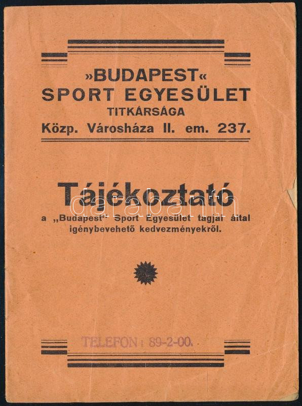 cca 1930 "Budapest" Sport Egyesület Titkársága által kiadott tájékoztató a tagok által igénybe vehető kedvezményekről, borítón szakadások, 15p