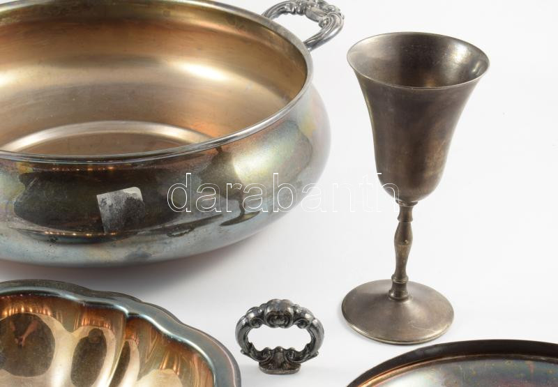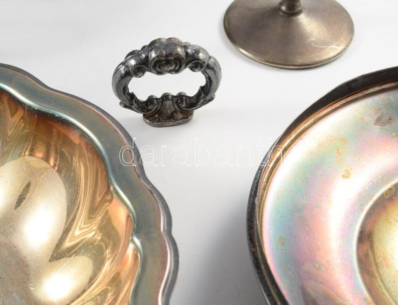 4 darab régi ezüstözött tárgy. Kínálóedény, kehely, fedő, kínáló, d: 31 cm alatt