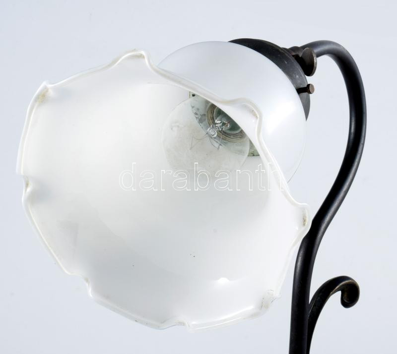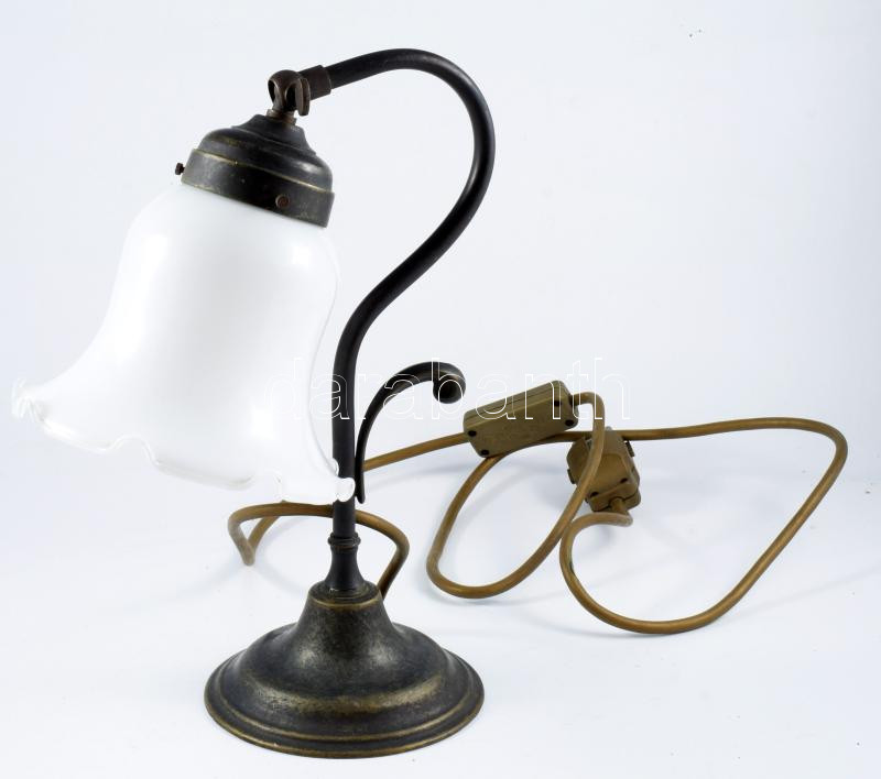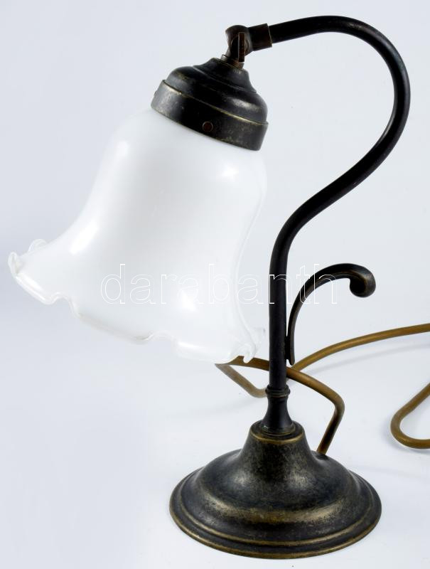 Antik asztali lámpa, tejüveg búrával, m: 29 cm