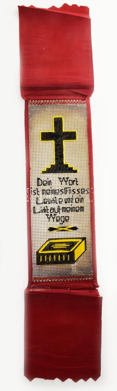 Keresztszemes hímzéssel díszített nagyméretű könyvjelző / szalag, német nyelvű vallásos szöveggel, kissé sérült, 53x10 cm