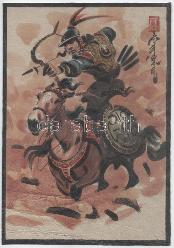 Kínai, bőrre festett kép, jelzett 20x32 cm