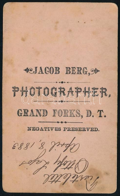 1883 Ottofy Lajos (1860-1939) magyar származású amerikai fogorvos, az amerikai gyermekfogászat-iskolafogászat úttörője, egyetemi tanár, főiskolai dékán, a japán fogorvosi oktatás szervezője dedikált fotója (,,Tisztelettel Ottofy Lajos April 8, 1883."), vizitkártya Jacob Berg fényképész (Grand Forks, Észak-Dakota, USA) műterméből, 10,5x6,5 cm. (1860-ban Pesten született, 1874-ben szüleivel kivándorolt az Egyesült Államokba. 1879-ben, 19 éves korában Saint Louis-ban szerzett fogorvosi oklevelet. Szakmai érdemei mellett irodalmi tevékenysége is jelentős volt. Mindeközben magyar identitását sem vesztette el, származását 1927-ben megjelent önéletrajzában is megemlíti. 1931-ben részt vett a budapesti Fogorvosi Világkongresszuson, ahol előadást is tartott.)