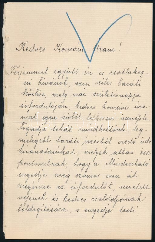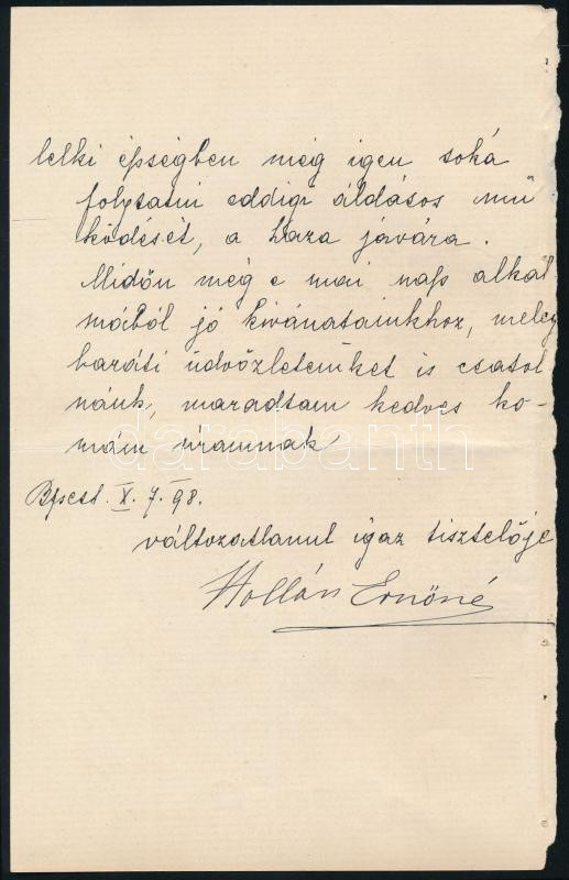 1898 Hollán Ernőné (1831-1906) saját kézzel írt levele Falk Miksa (1828-1908) író, politikus részére