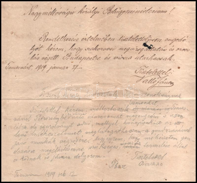 1919 Temesvár, engedély kérelem a szerb királyi belügyminisztériumhoz Budapestre, egészségügyi vizsgálat céljából, rajta a ceruzás válasszal, 1919. jan. 27. - feb. 27., 1 sztl. lev.