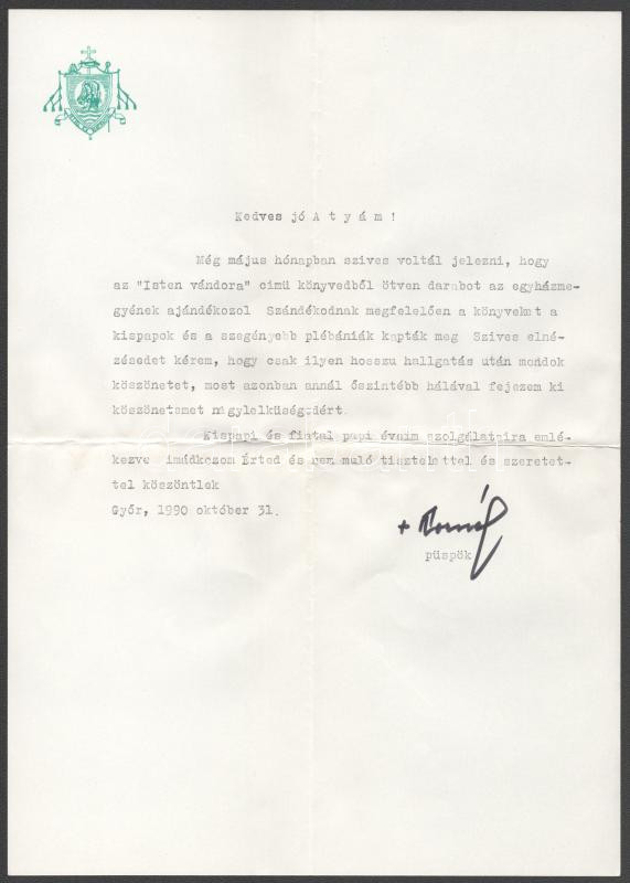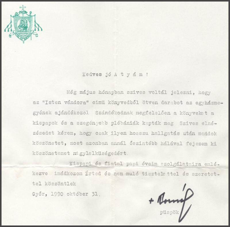 1990 Pataky Kornél (1920-1998) győri püspök saját kezűleg aláírt levele, fejléces papíron