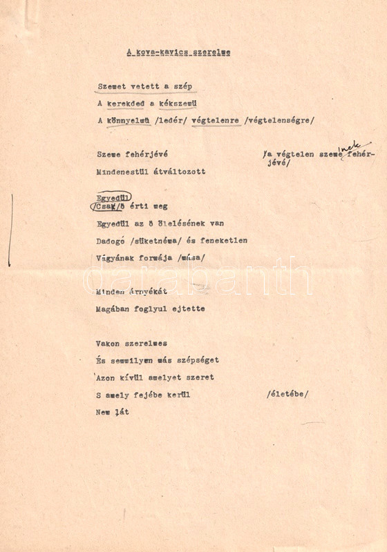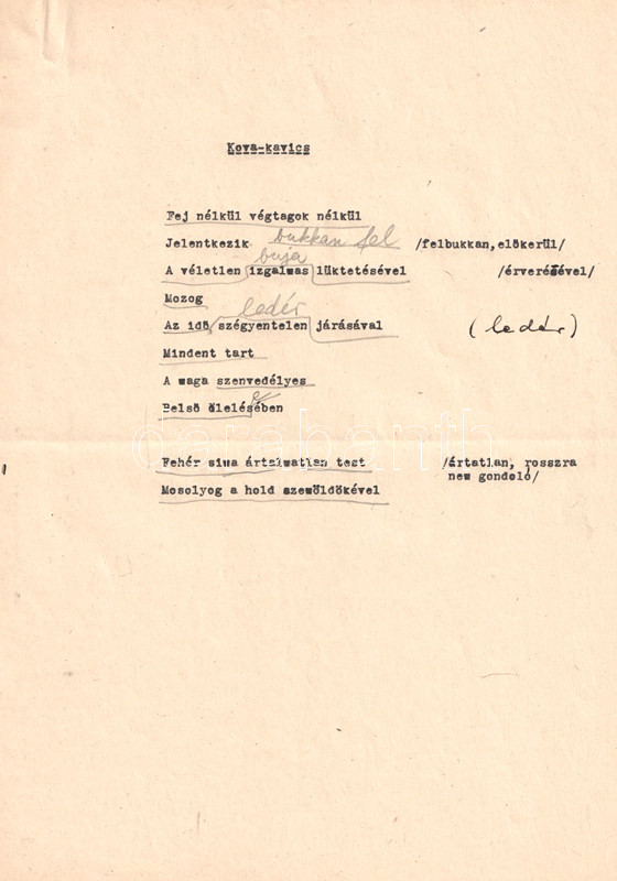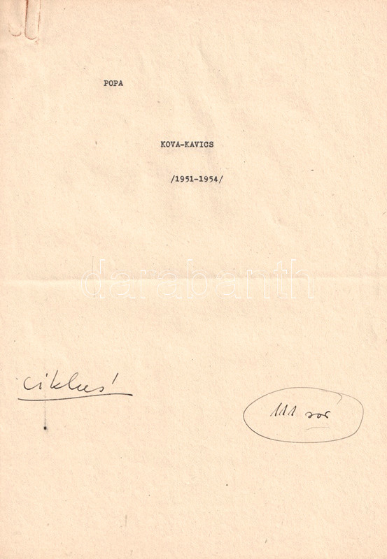 [Kézirat] Weöres Sándor 8 gépelt oldal terjedelmű, saját kézzel sűrűn javított műfordítás-kézirata Vasko Popa (1922-1991) román származású szerb költő "Kavics" című versciklusáról.