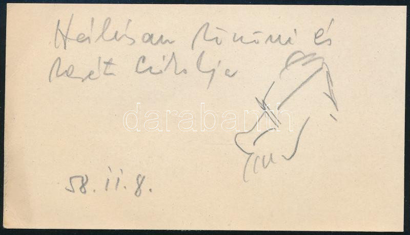 Láng Rudolf (1904-1991) festő, grafikus, jelmeztervező autográf sorai névjegykártyáján