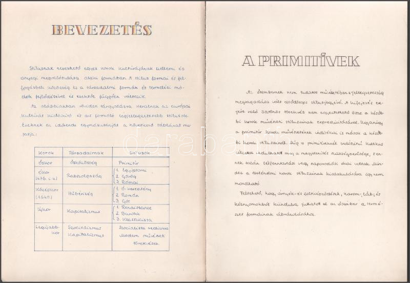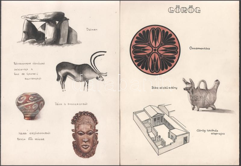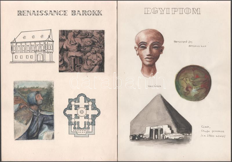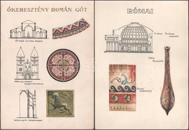 Vegyes művészeti stílusokat ábrázoló táblák, kézzel készített illusztrációk, 8p