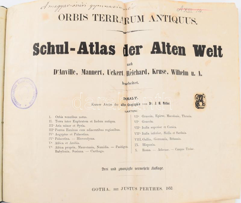 Orbis Terrarum Antiquus. Schul-atlas der Alten Welt nach D'Anville, Mannert, Uckert, Reichard, Kruse, Wilhelm u. A. bearbeitet. Gotha, 1852, Justhus Perthes, 2+14 p. + 15 t. Német nyelven. Teljes! Német nyelven. Korabeli félvászon-kötés, kopott borítóval, aláhúzásokkal és bejelölésekkel, bejegyzésekkel, régi könyvtári példány.