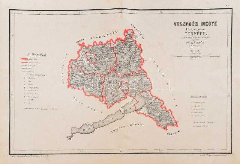 cca 1890-1900 Veszprém megye közigazgatási térképe (a Balatonnal). Hivatalos adatok alapján rajzolta: Hátsek Ignác m. kir. térképész. 1 : 500.000, metsz. és nyomta: Posner Károly Lajos, Bp., Rautmann Frigyes kiadása. Hajtva, 50,5x37,5 cm