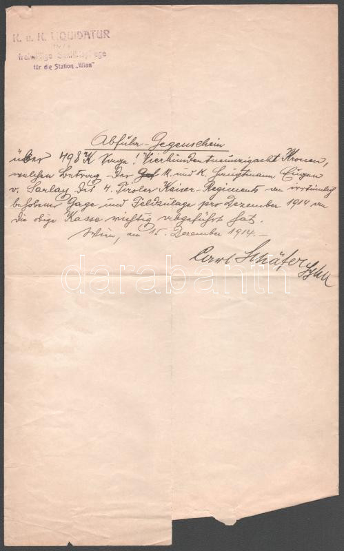 1914 K. u.k. Liquidatur - Carl Schäfer által aláírt igazolás