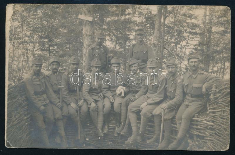 I. világháborús katonai csoportkép a fronton, az egyik katona kezében cicával, fotólap, egyik sarkán kissé sérült, 9x14 cm