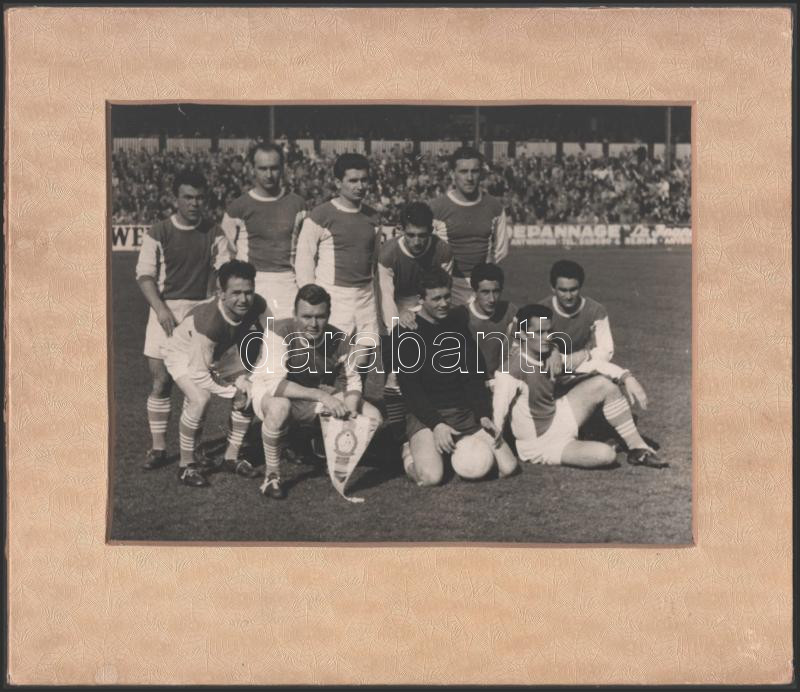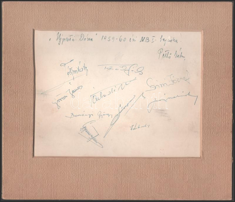 Újpesti Dózsa (UTI) 1959-1960. évi NB. I. bajnokcsapa fotója, aláírásokkal. rajta Göröcs, Simi Tóth Mihály II (Aranycsapat), id. Várhidi, Bosányi, Szusza Ferenc, Pethő Gábor, stb., fotó paszpartuban, 17,5×22 cm