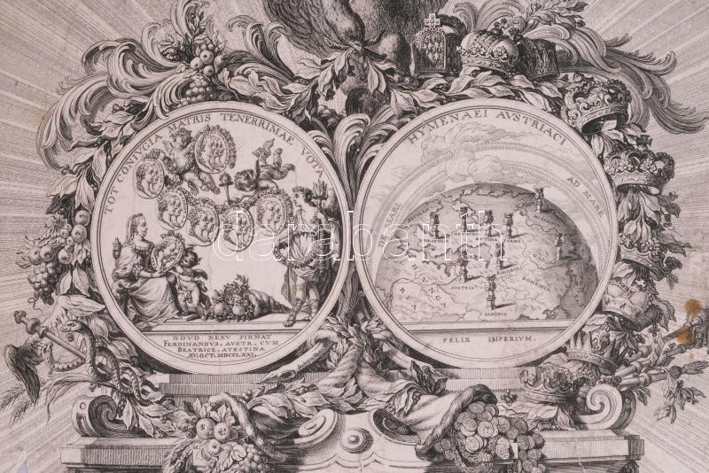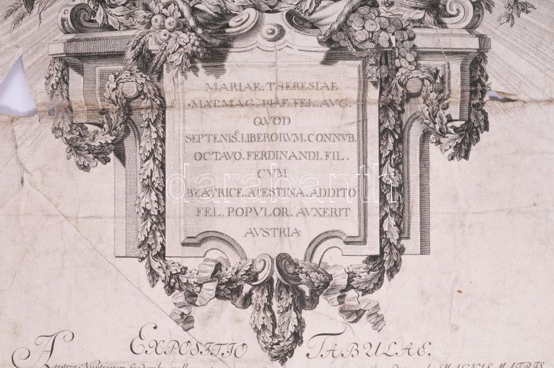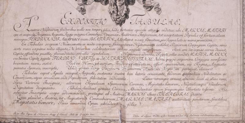 1771 Mária Terézia fia, a Habsburg?Lotaringiai-házból származó Ferdinánd Károly főherceg és az Estei-házból való Mária Beatrix modenai hercegnő 1771-es házasságát és a dinasztia megalapítását ünnepló oklevél. Rézmetszet. Sérülésekkel. 35x53 cm