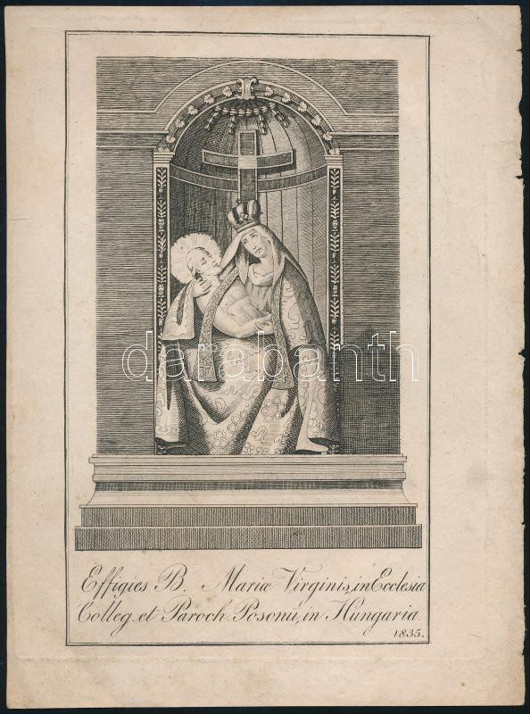 1835 Dorneck, Joseph (működött Bécsben, az 1820-1830-as években): A pozsonyi Szent Szűz kápolna oltárképét ábrázoló rézmetszet Effiges B. Mariae Virginis in Ecclesia et Paroch, Posonii in Hungaria). Rézmetszet, papír, a lap szélén apró sérüléssel, kis foltokkal, 18x11 cm. [In: Jordánszky Elek: Magyar országban 's az ahoz tartozó részekben lévő Bóldogságos Szűz Mária kegyelem' képeinek rövid leírása. Pozsony, 1836.]