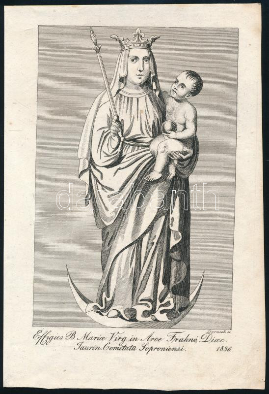 1836 Dorneck, Joseph: A fraknói Szűz Mária-búcsújáró hely kegyszobra (Effigies B. Mariae Virg. in Arce Fraknó, Dioec. Jaurin. Comitatu Soproniensi). Rézmetszet, papír, jelzett a metszeten, 18x11 cm. [In: Jordánszky Elek: Magyar országban 's az ahoz tartozó részekben lévő Bóldogságos Szűz Mária kegyelem' képeinek rövid leírása. Pozsony, 1836.]
