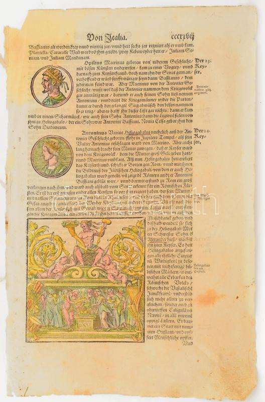 Alexander (Haliogabalus) és Maximinus Thrax, Spilius Macrinus, Antonius római uralkodók tetteit bemutató lap Münster, Sebastian: Cosmographiae. Basel, 1580. , fametszet, papír, . Színezett fametszet 5 db képpel Lap méret 22x35 cm