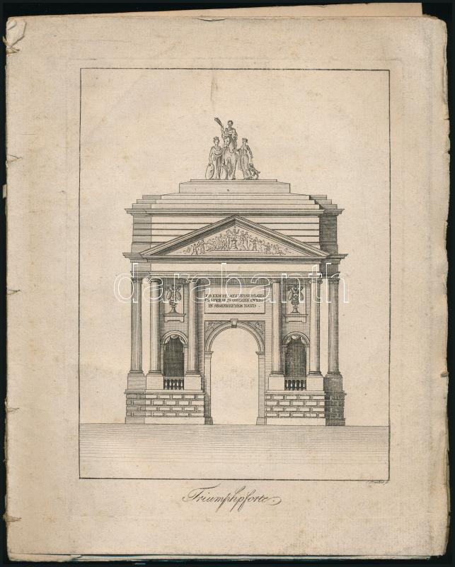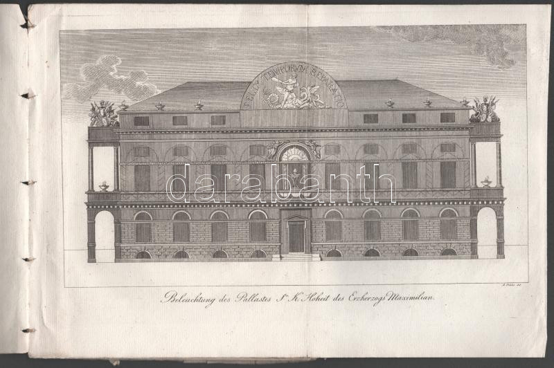 ca 1800 18 db épületeket ábrázoló rézmetszet. Az osztrák birodalom hivatali épületei, síremlékek, kastélyok, 15x20 cm és 33x24 cm (kihajtható) méretben. ca 1800 18 copper engravings depicting buildings. Office buildings, tombs, castles of the Austrian Empire, in sizes 15x20 cm and 33x24 cm (fold-out).