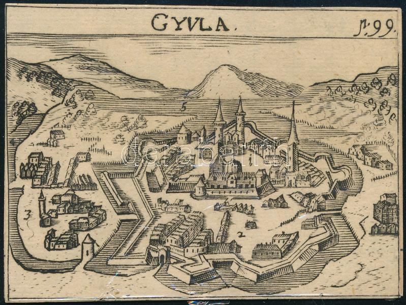 cca 1810 Gyula várának látképe, metszet, kartonra ragasztva, 6×8 cm