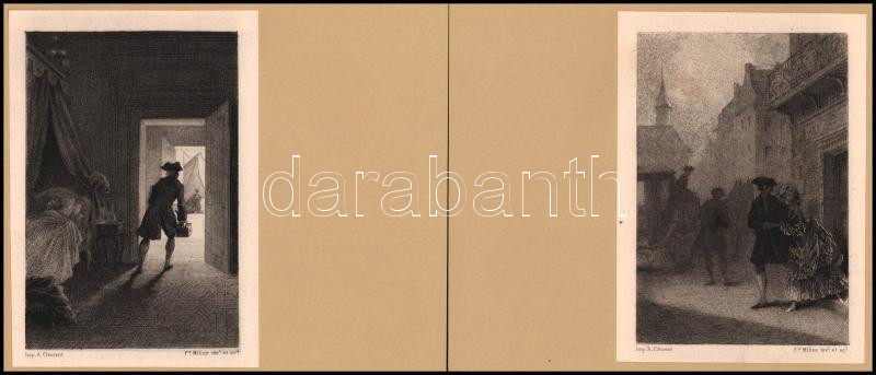 cca 1860 Félix Augustin Milius (1843-1894): Hétköznapi jelenetek, 2 db papírlapra ragasztott rézmetszet, 12×8 cm