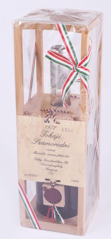 1972 Tokaji Szamorodni, muzeális, száraz, fehér bor, bontatlan csomagolásban, nemzeti szín szalaggal, 4336. számú számozott példány, 13,5%, 0,5l