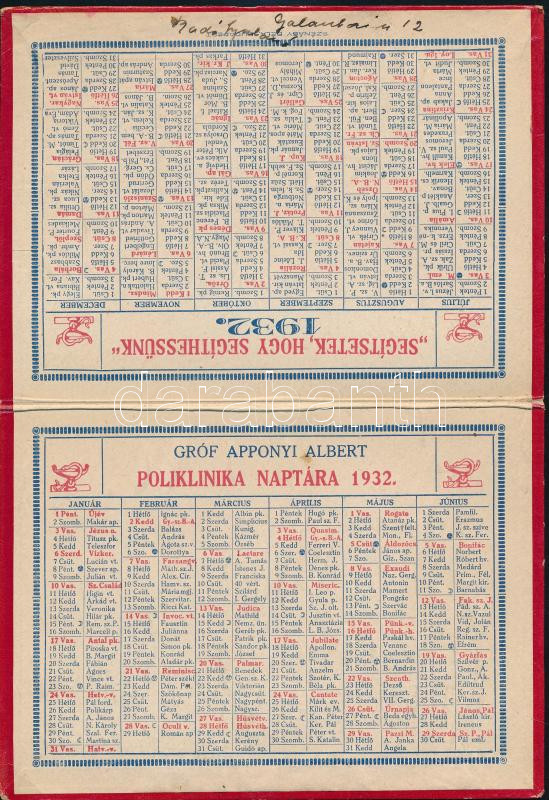 1932 A Gróf Apponyi Albert Poliklinika éves naptára kemény kartonra ragasztva, jó állapotban