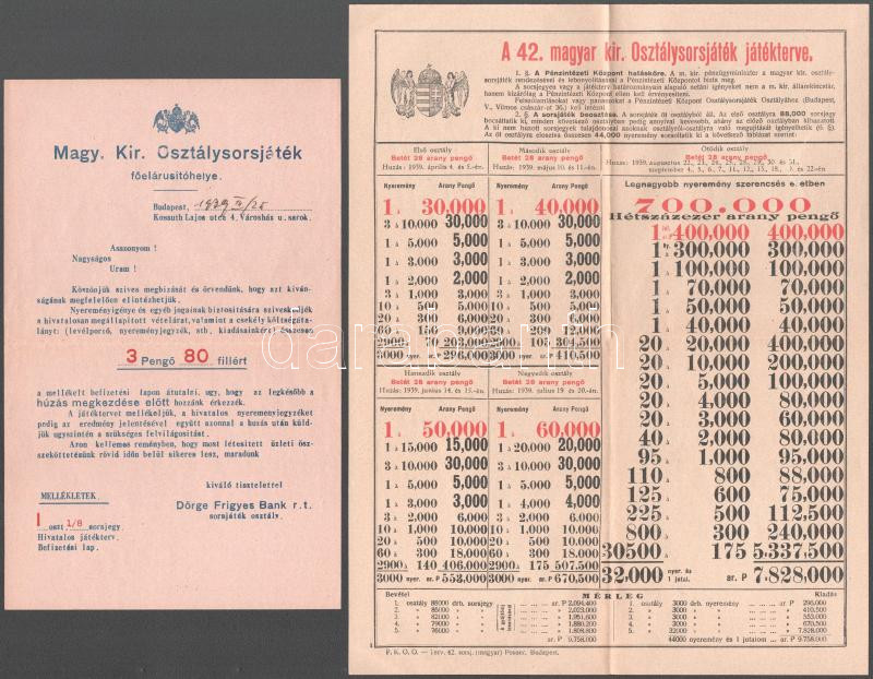 1937-1939 M. Kir. Osztálysorsjáték és Dörge Frigyes Bank R.T. nyomtatványok, 5 db