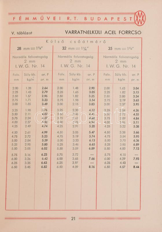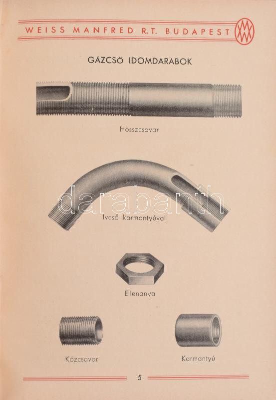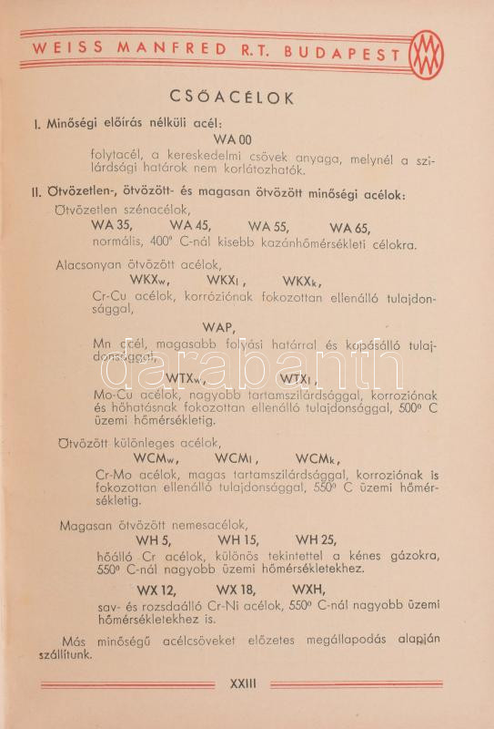 1939 Weiss Manfréd árjegyzék, képes. Acélcső gyártmányok 213p. Kiadói vászonkötésben ex librissel, könyvjelzővel