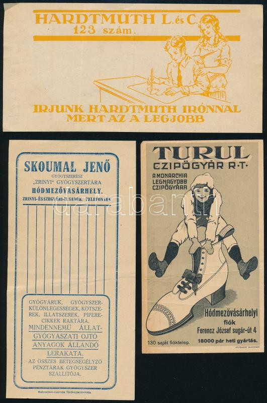 3 db hódmezővásárhelyi számolócédula: Turul Cipőgyár R.T., Skoumal Jenő gyógyszerész ,,Zrínyi" gyógyszertára, Hardtmuth (hátoldalukon kézzel írt nyugtával)